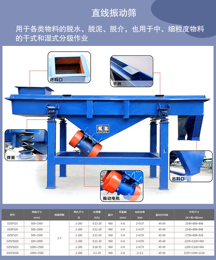直線振動篩篩箱的運動軌跡為直線或接近直線,它有兩個軸,所以又稱雙軸振動篩。直線振動篩水平或傾斜安裝,這類振動篩結(jié)構緊湊,運行平穩(wěn),被廣泛用于各類物料的脫水、脫泥、脫介,也用于中、細粒度物料的干式和濕式分級作業(yè)。我廠生產(chǎn)的直線振動篩種HZSF型號就是直線振動篩代表性的產(chǎn)品。
