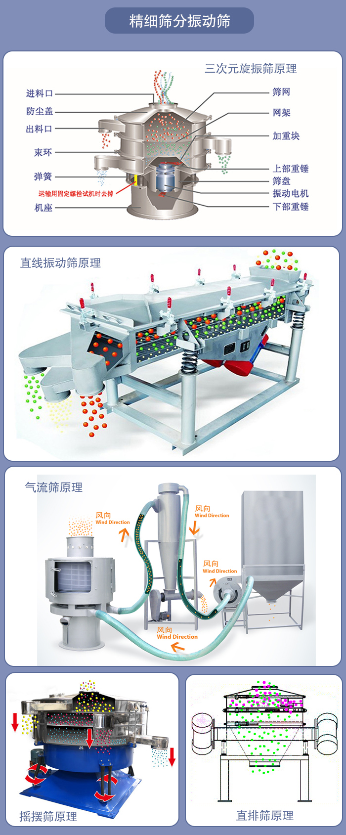 直排篩的原理是通過振動源的作用使物料在篩面做三維運動,這種運動方式可以使結塊物料散開,快速的通過篩網(wǎng)。精細物料直接由下部排出,雜物粗料則通過排渣出料口排出。