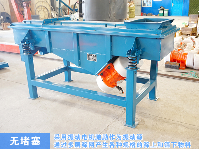 直線振動(dòng)篩采用振動(dòng)電機(jī)激勵(lì)作為振動(dòng)源,使物料在篩網(wǎng)上拋起,同時(shí)直線前進(jìn)。物料從進(jìn)料器均勻進(jìn)入篩選機(jī)進(jìn)料口,通過多層篩網(wǎng)產(chǎn)生各種規(guī)格的篩上和篩下物料,分別從各自的出口排出,不存在堵塞現(xiàn)象,產(chǎn)量高。