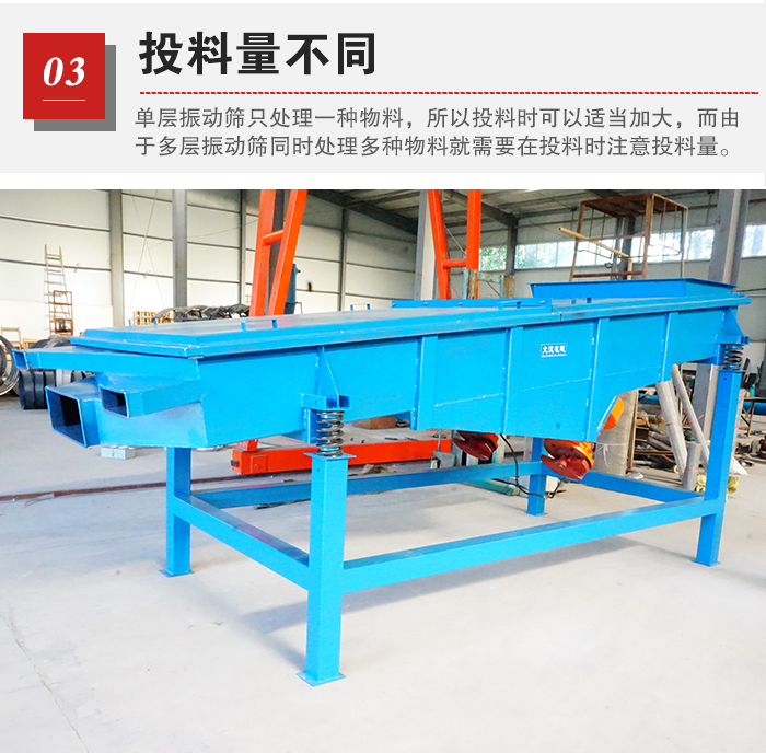 物料的篩分能力是由投料的大小有著直接關(guān)系的,由于單層振動篩只處理一種物料,所以投料時可以適當加大,而由于多層振動篩同時處理多種物料就需要在投料時注意投料量。