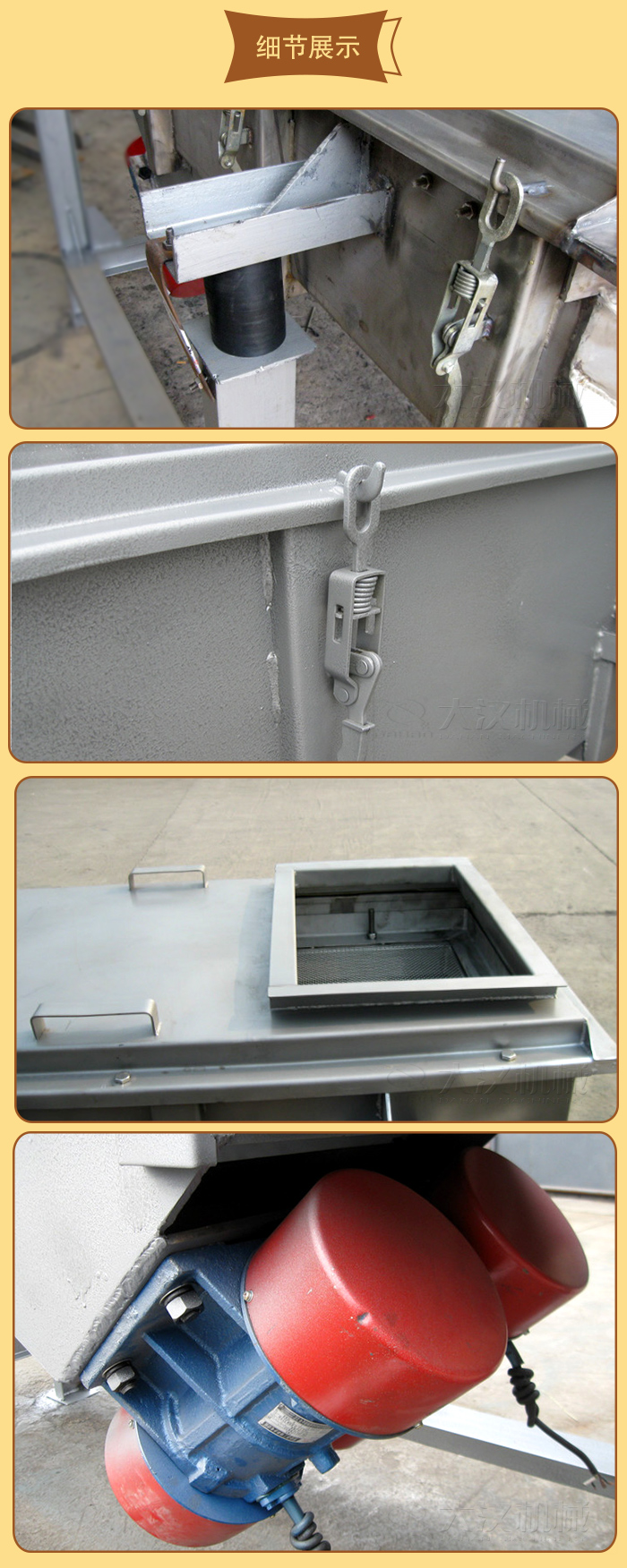 5、電機(jī)臺座:安裝振動電機(jī),使用前連接螺釘必須擰緊,特別是新篩機(jī)試用前三天、必須反復(fù)緊固,以免松動造成事故。