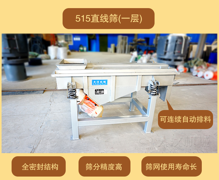 DZSF-515直線篩(寬)500mm×1500mm(長),體積小移動方便,價(jià)格便宜。大漢直線振動篩廠家可為客戶量身定做特殊要求的直線振動篩(單層或多層)。515直線振動篩按材質(zhì)分為304不銹鋼材質(zhì)和碳鋼材質(zhì)。